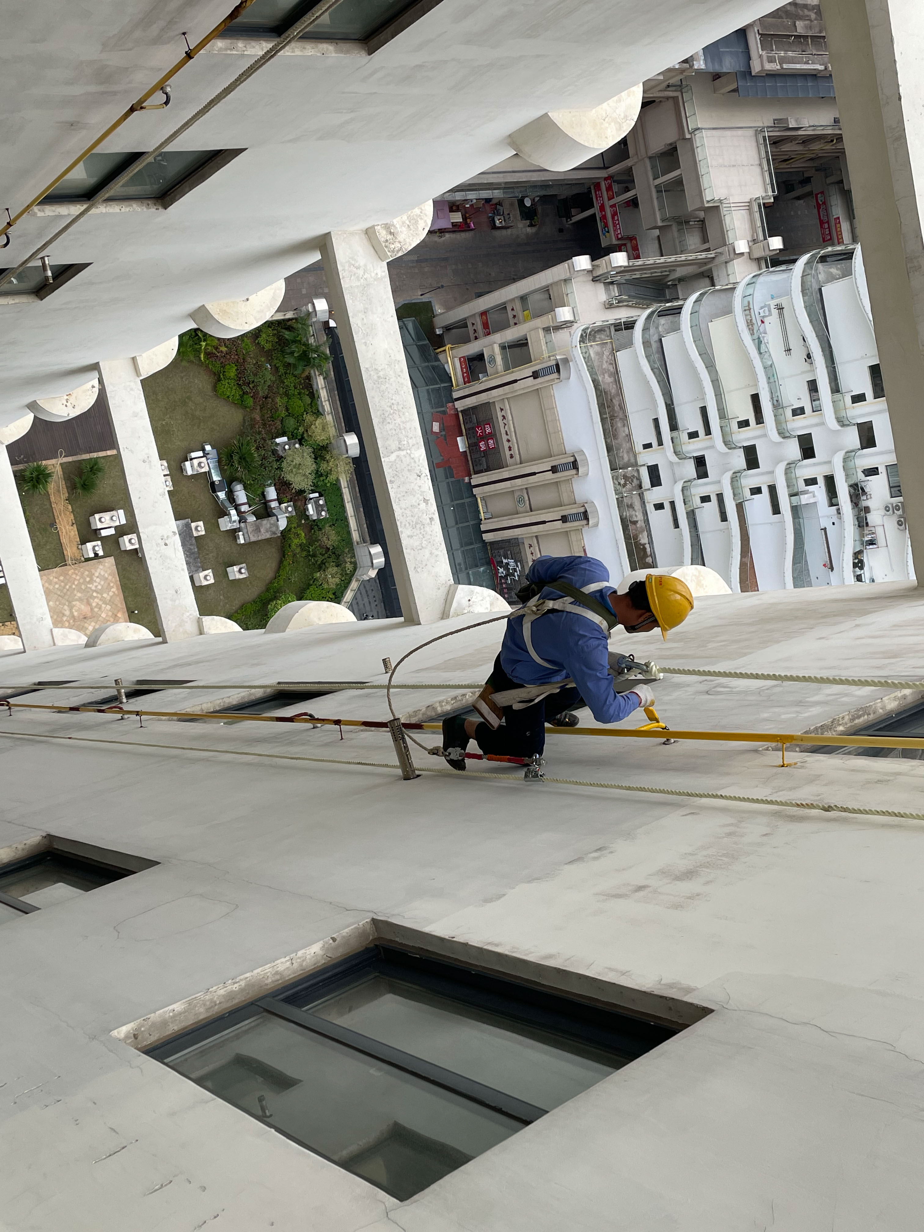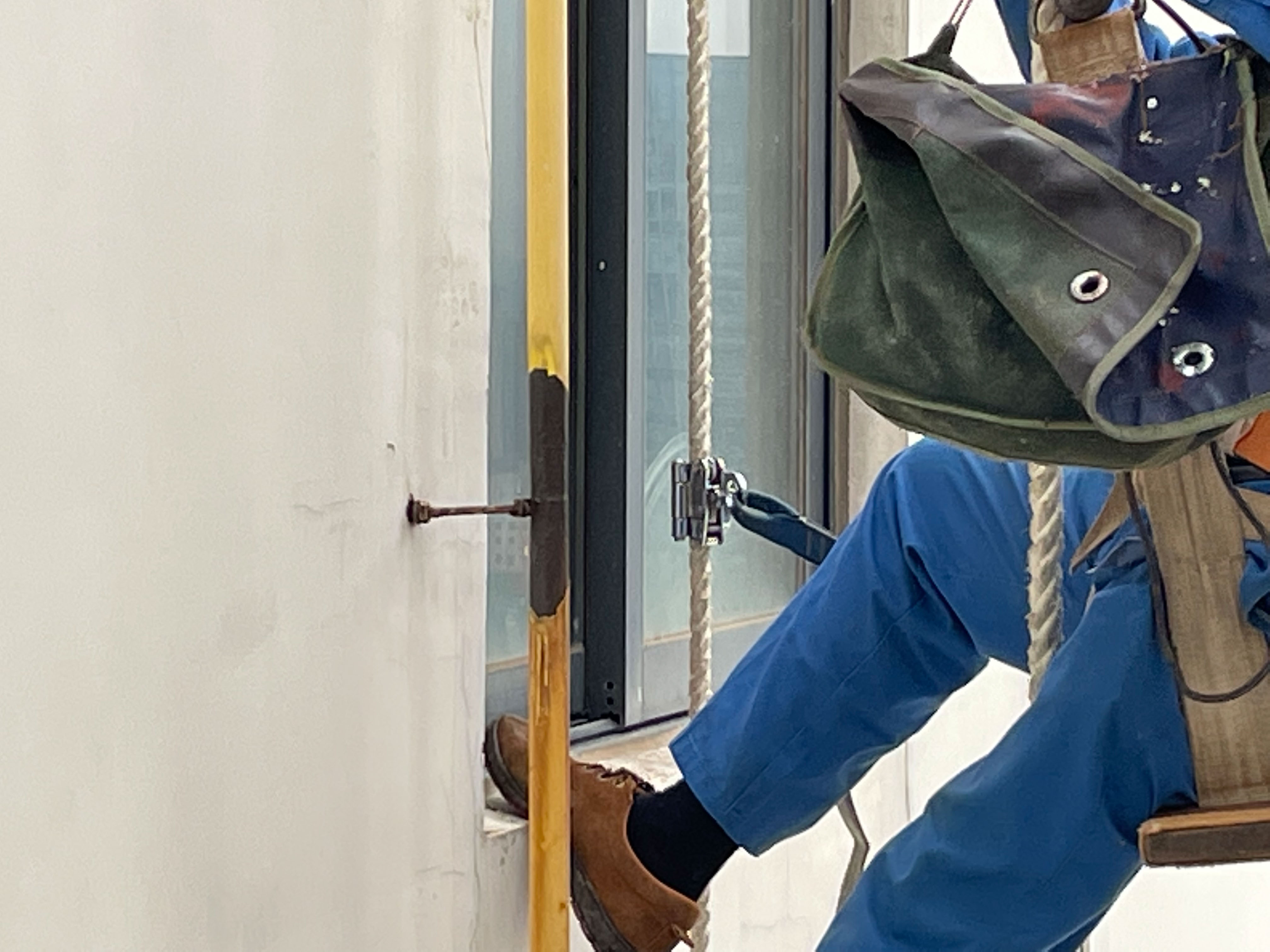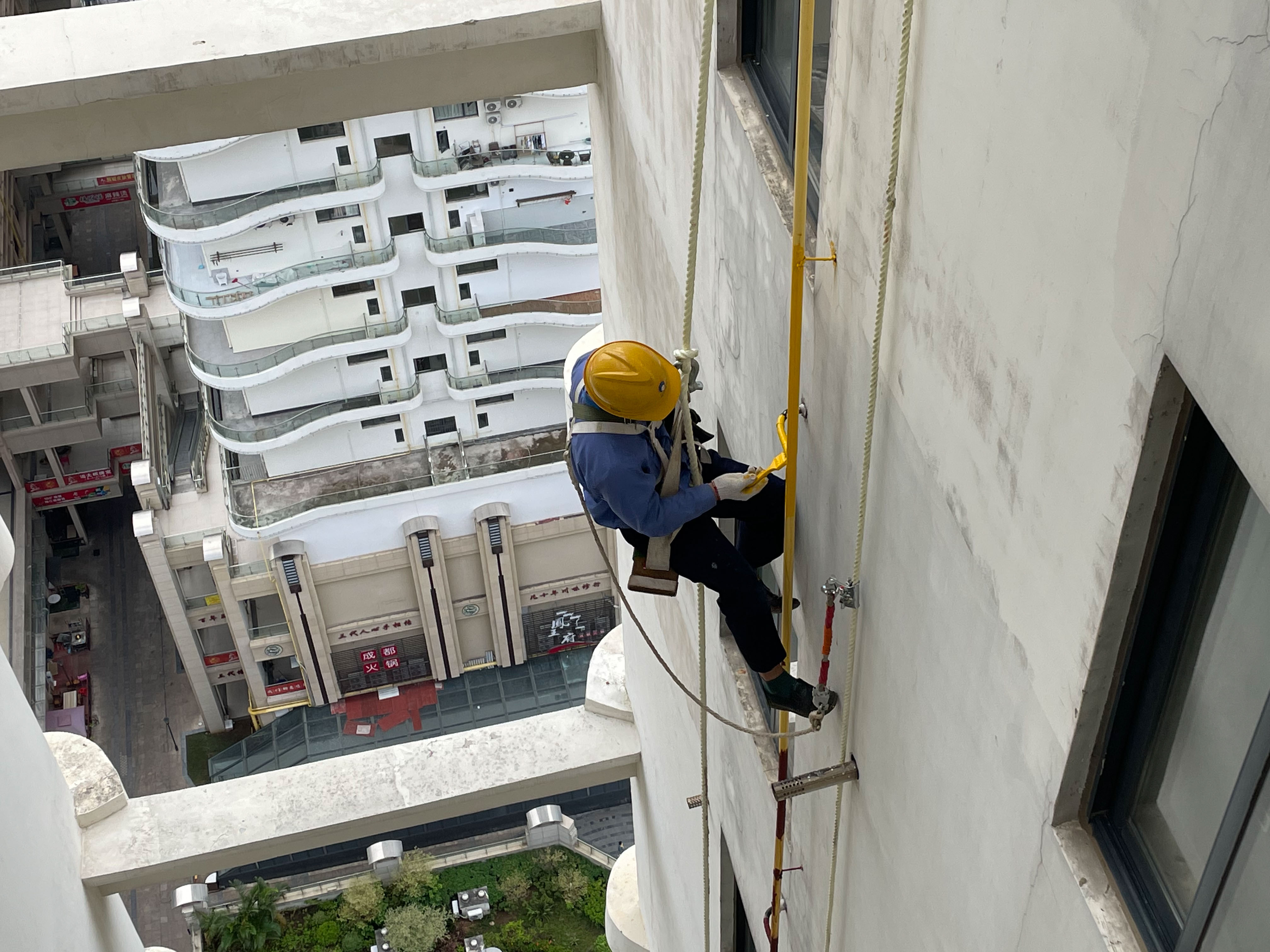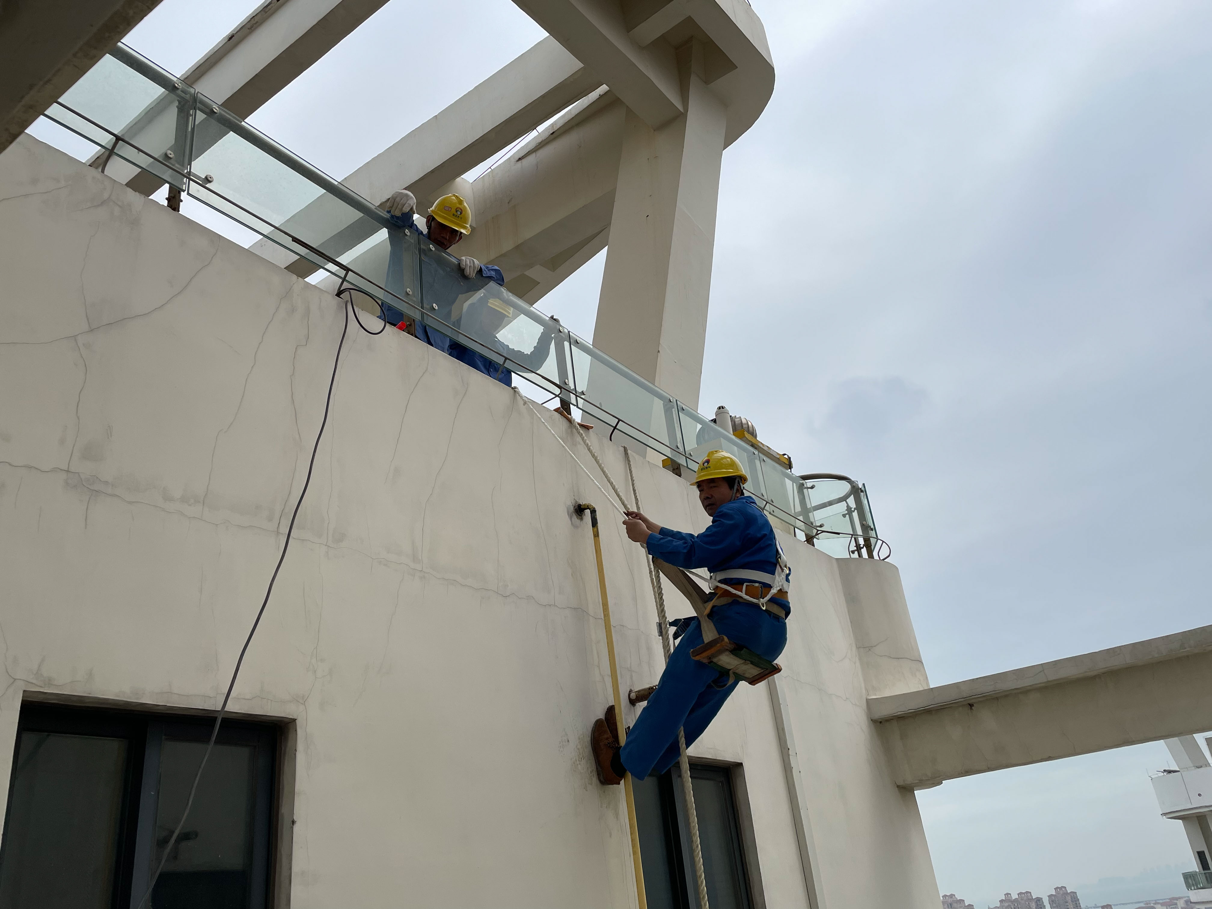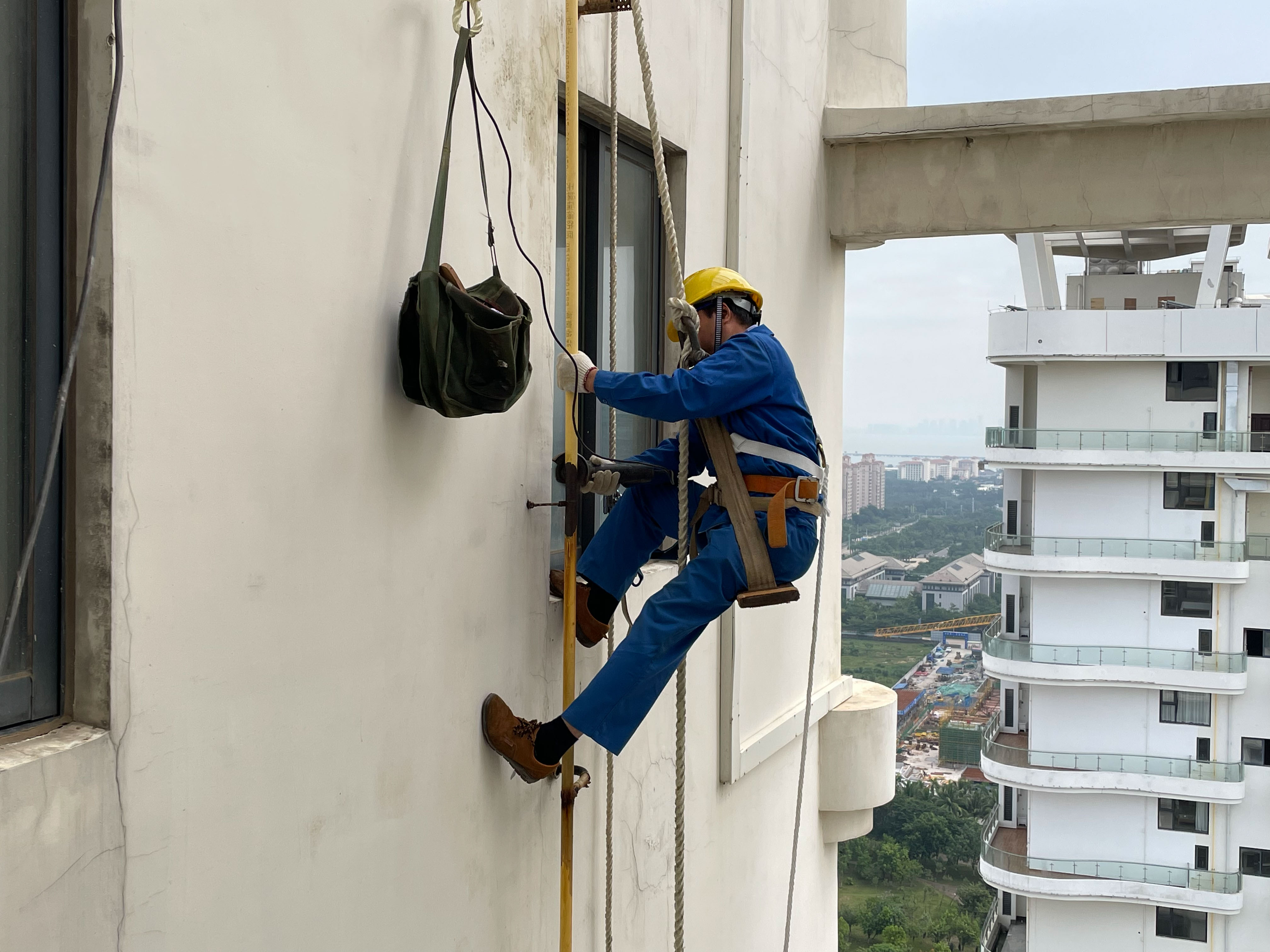 10月24日上午,海口远大公寓3号楼,高空作业人员正在对外表脱漆腐蚀的燃气立管进行打磨除锈