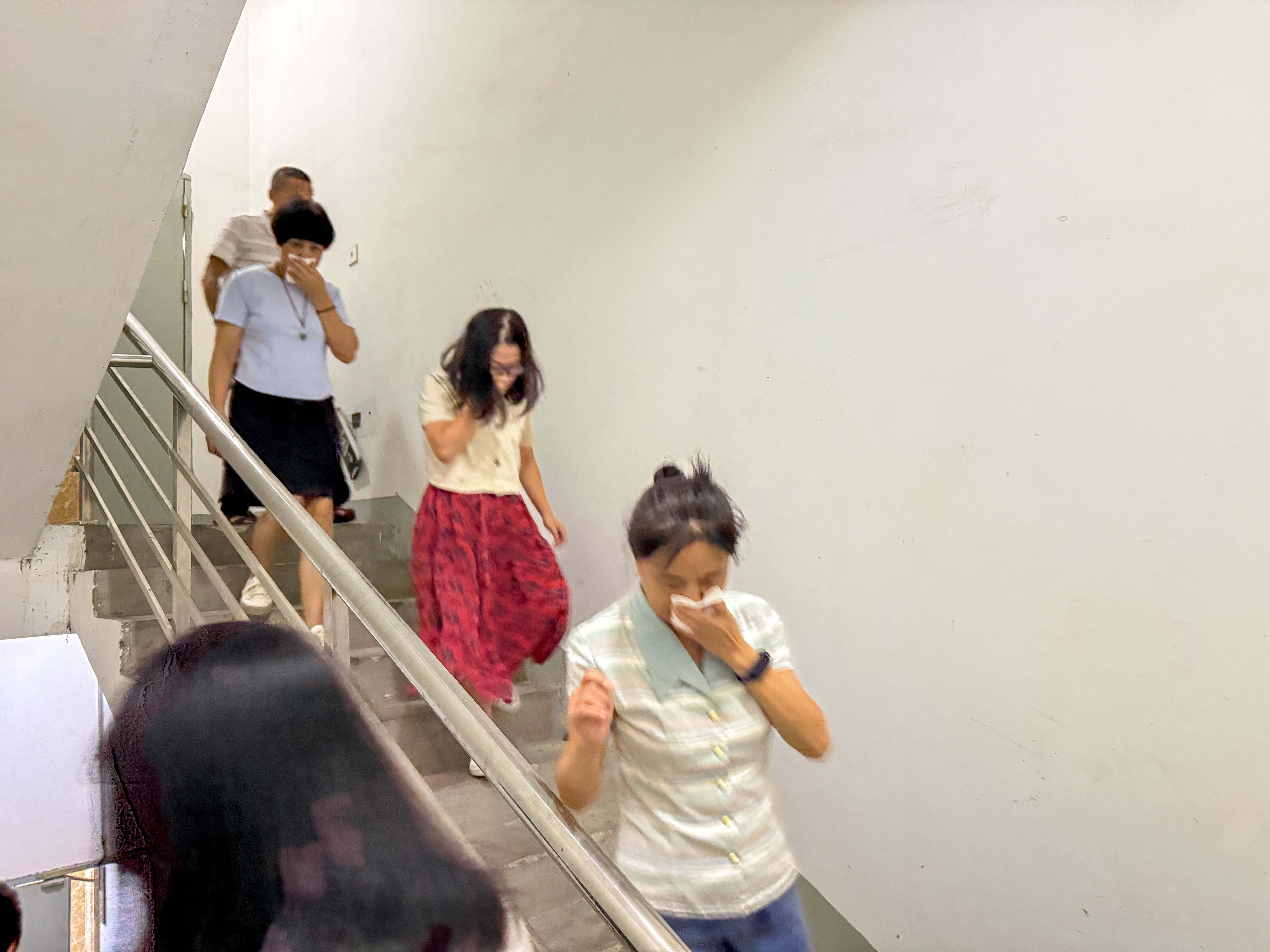 下午3点10分,办公区消防警报响起,楼内工作人员用湿毛巾捂住口鼻,根据预先制定的消防逃生路线快速有序地从应急通道撤离,顺利抵达指定安全区域。